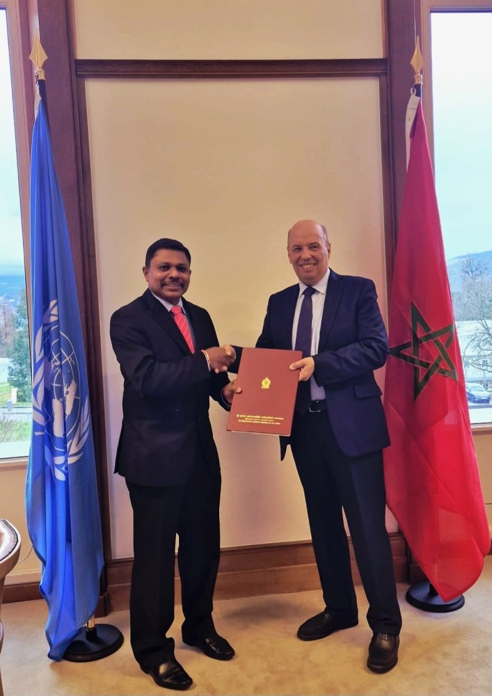 Ambassador Sumith Dassanayake, Sri Lanka’s newly appointed envoy to the United Nations in Geneva met Ambassador Omar Zniber of Morocco, the current President to the Conference on Disarmament on 19 February 2026 and presented his Credentials as Sri Lanka’s new Permanent Representative to the Conference on Disarmament.